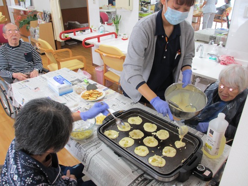 今回のおやつレクは以前、畑で採れたさつまいもを使ったパンケーキです