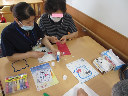 台紙に金魚や水玉等の涼しげな絵を貼っていきます